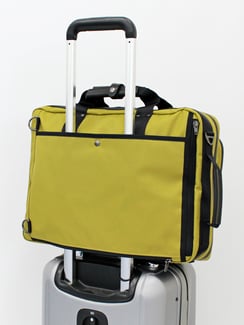 本体背面にキャリーバーを通し、スーツケースにセットアップすることで旅行や出張時の移動が快適になります。また、キャリーバーを通さない場合は底側のファスナーを閉めてポケットとして使用することができます。